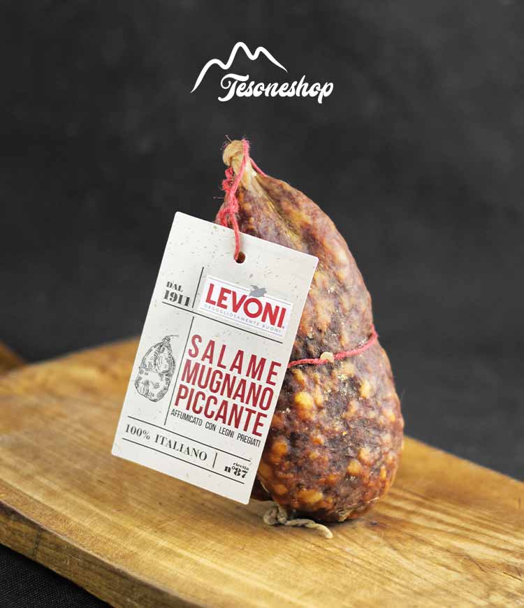 Salame da 300 g circa Salame originario della Campania, la terra del Vesuvio, dall'impasto a grana grossa. Come da tradizione; insaccato in budello naturale a cui seguono una leggera affumicatura naturale e l’aggiunta di peperoncino e paprica che lo rendono decisamente piccante. Levoni utilizza esclusivamente carni provenienti da suini nati ed allevati in Italia. Senza glutine e lattosio.
